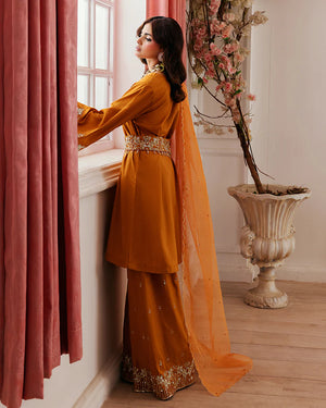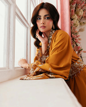 - Raw Silk ensemble, meticulously crafted with sequin embroidery, pearls, stones, and crystal embellishments.