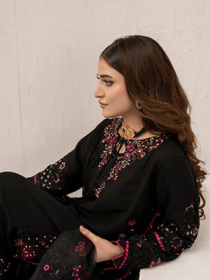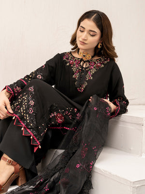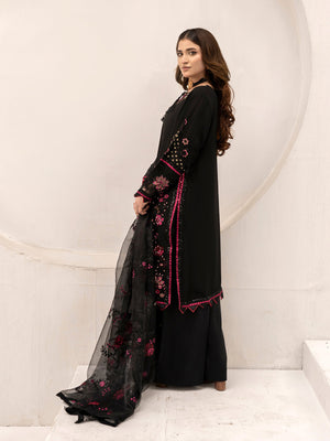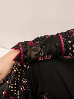 Midnight Muse, a stunning 3-piece black chiffon set for women. This Eastern ready-to-wear outfit includes a fully lined chiffon shirt, soft Grip trousers, and a flowy chiffon dupatta - ideal for festive occasions and party wear. With its timeless black hue and lightweight fabrics, this versatile ensemble offers both grace and comfort for all-season celebrations.
