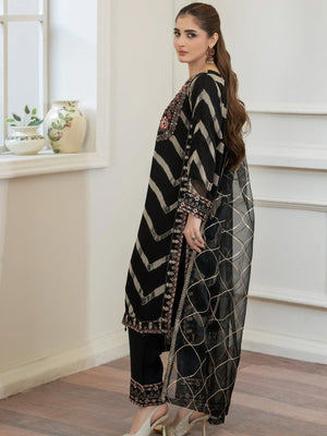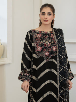 Unveil a touch of sophistication with Black Sand, a stunning 3-piece chiffon kurta set crafted in timeless black. This Eastern-ready outfit features intricate tie-and-dye work, along with a fully lined kurta, matching trousers, and a beautifully flowing dupatta, making it an exquisite choice for festive occasions and year-round celebrations.