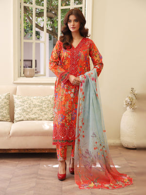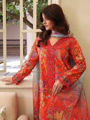 Deep Orange Digital Print Lawn-Cotton 3-Piece Suit