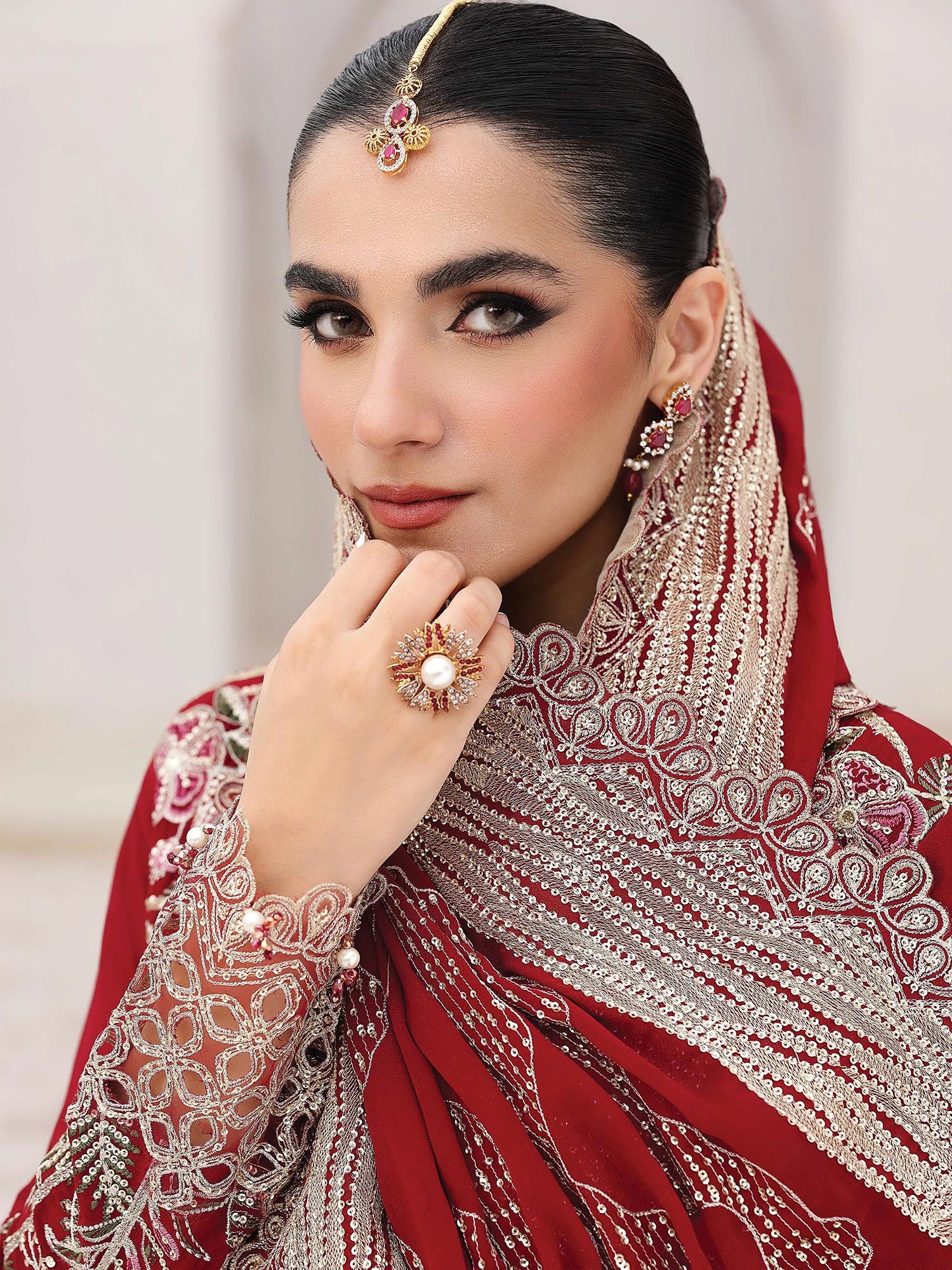 - Chiffon dupatta embellished with spangle embroidery and pearl accents and scalp