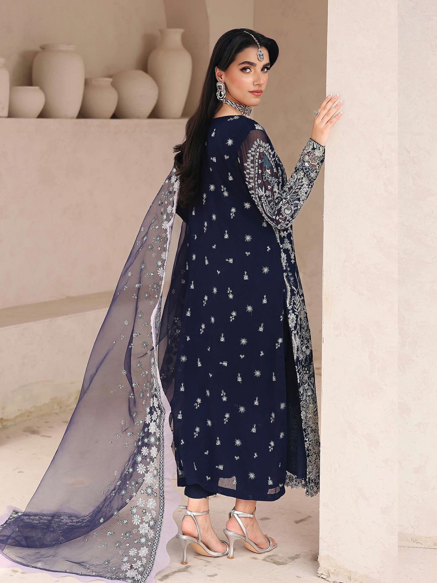 - Organza dupatta embellished with intricate sequin embroidery and scalloped borders