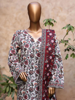 Bin Saeed Printed Khaddar 3-Piece Suit - White & Red