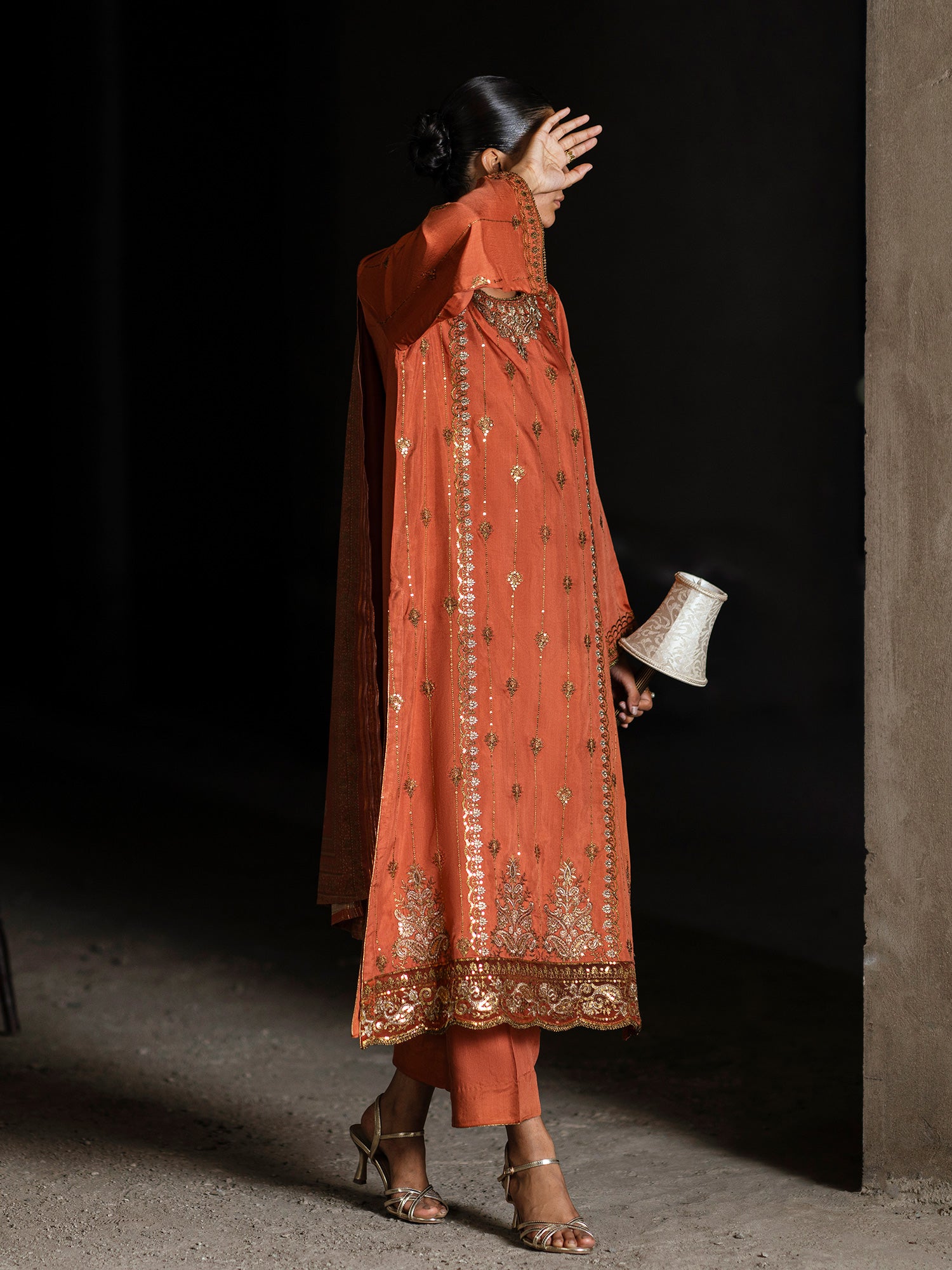 This outfit is a burnt orange silk-viscose suit, adorned with delicate golden embroidery running in vertical patterns. The design elongates the silhouette gracefully, bringing a perfect blend of elegance and sophistication — an ideal choice for festive and formal wear.