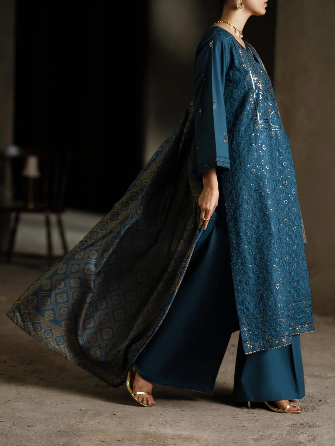 This outfit is a deep teal silk-viscose ensemble, enriched with geometric embroidery and delicate mirror accents across the bodice. The design blends modern flair with traditional elegance, making it a standout choice for festive gatherings and formal evenings. Its graceful drape and refined detailing ensure both comfort and sophistication.