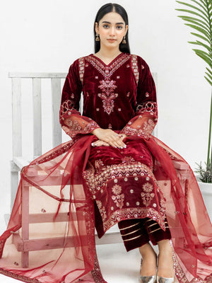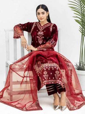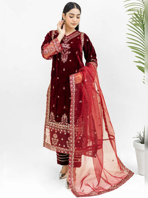 Rangz Velvet Embroidered 3-Piece Suit - Red