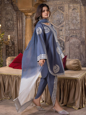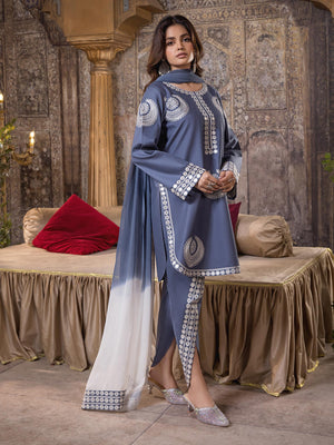 Heera's Blue-Grey Luxury Embroidered 3-Piece Suit