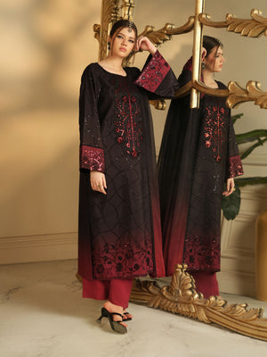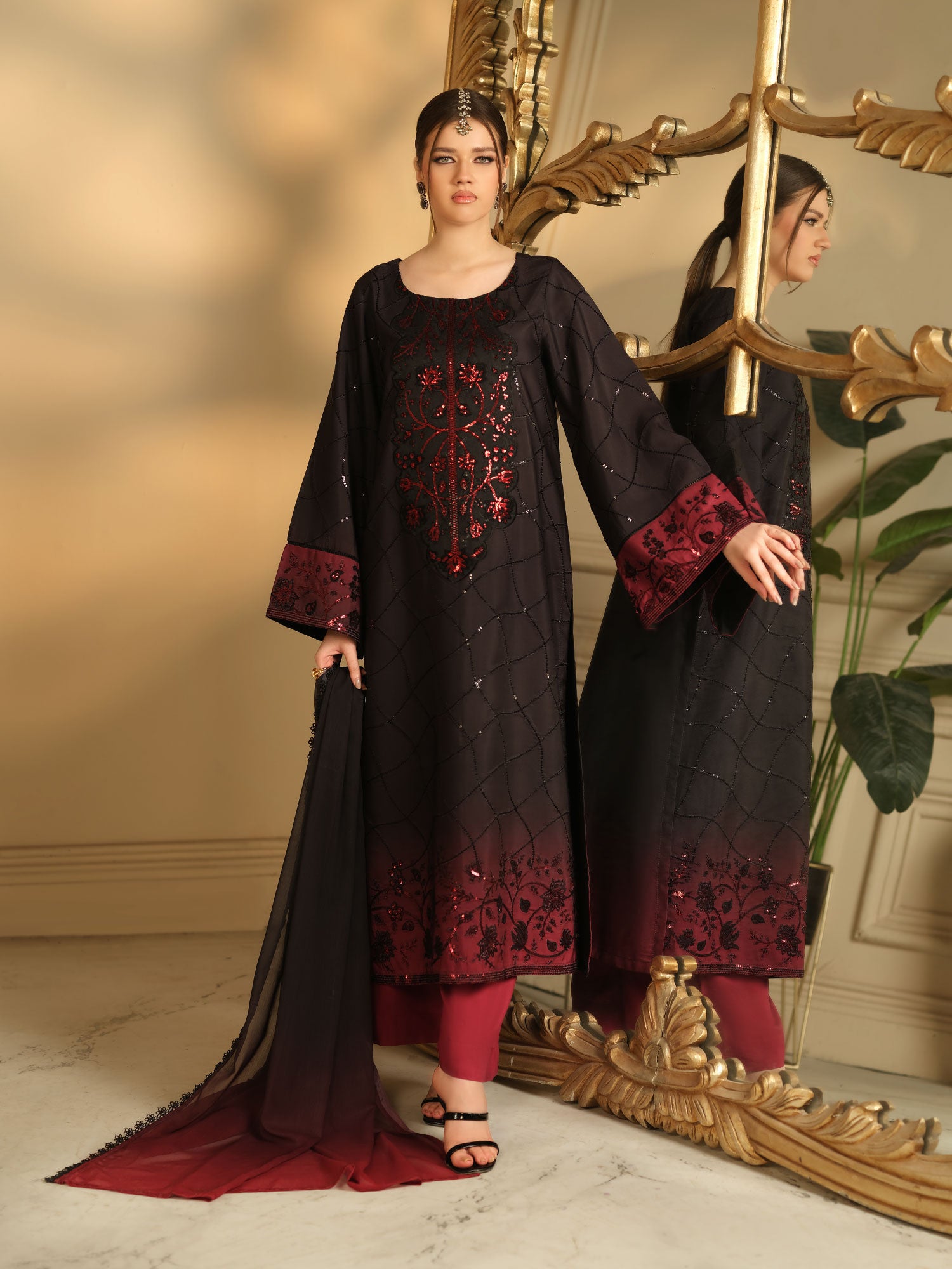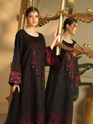 - Shirt: This shirt is crafted from premium cambric cotton fabric and features elegant sequin embroidery on the front, creating a striking contrast against the dark base. The design is further enhanced with subtle all-over detailing, while the sleeves are finished with rich embroidered borders that add depth and sophistication. The daman showcases a beautifully blended gradient with intricate embroidery, completing the look with a refined touch.