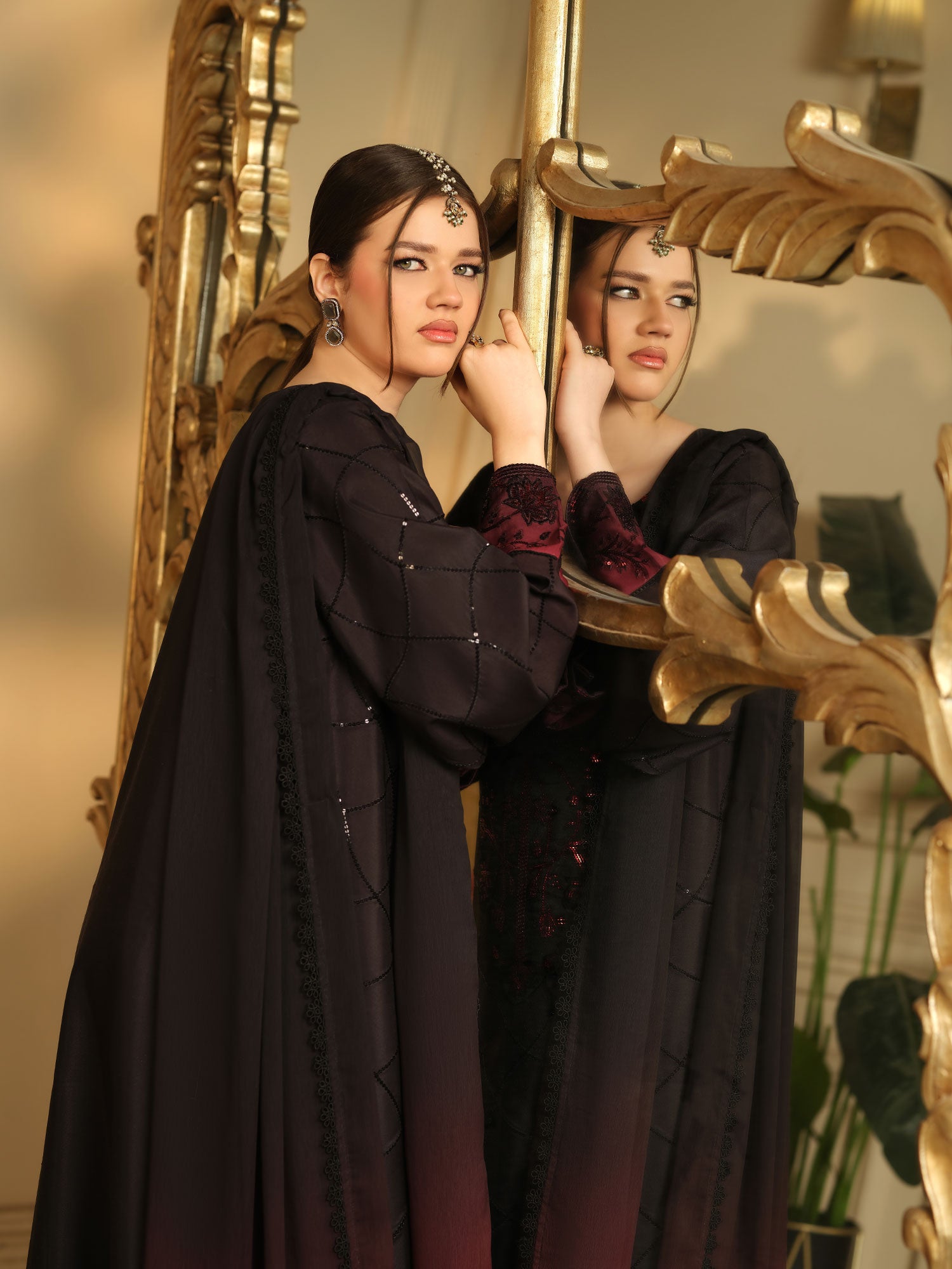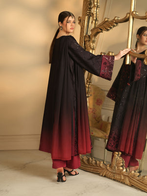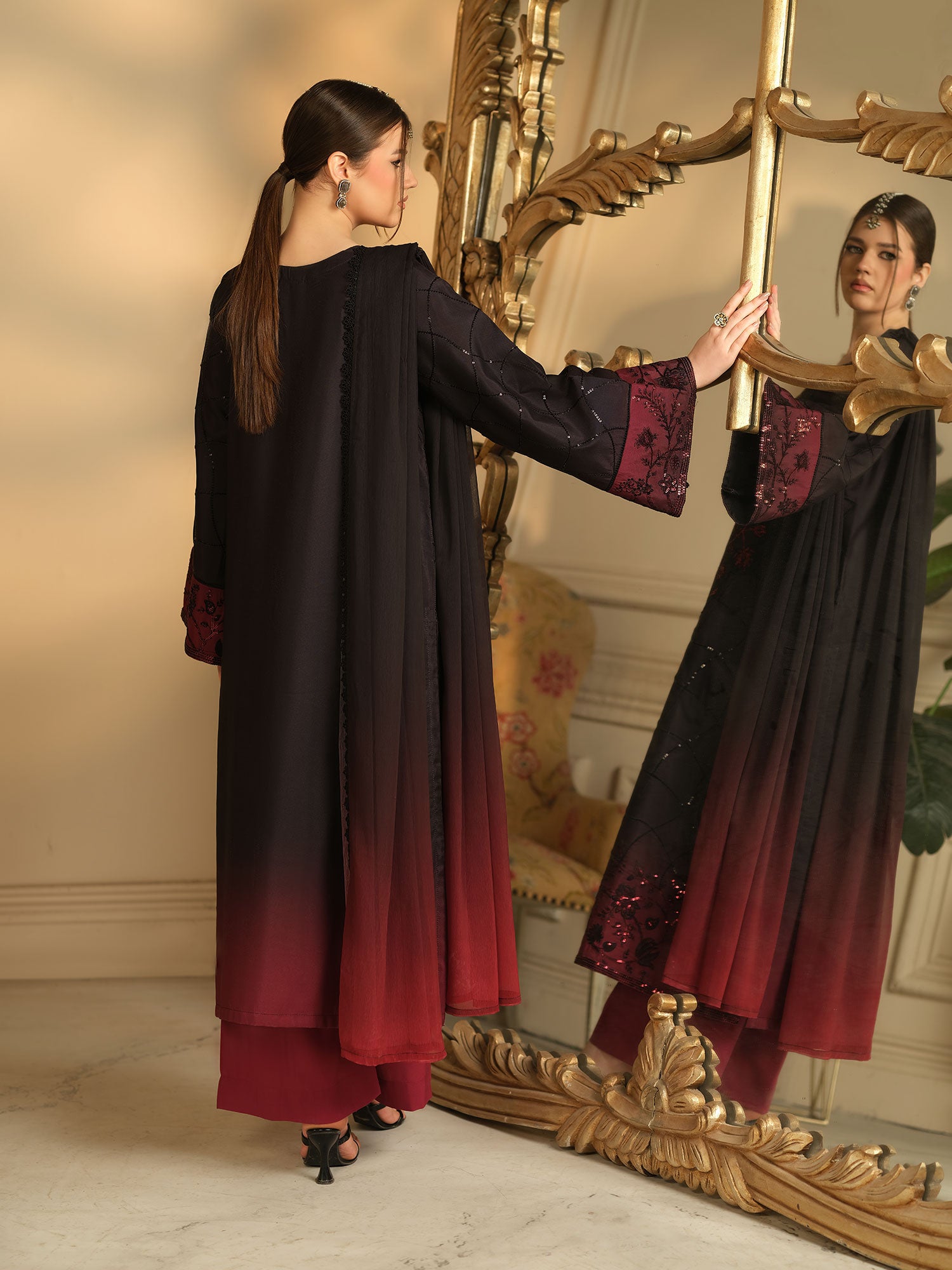 - Dupatta: The set is completed with a chiffon dupatta featuring a subtle ombré effect, elegantly flowing from dark to deep maroon, adding a soft and graceful finish to the ensemble.