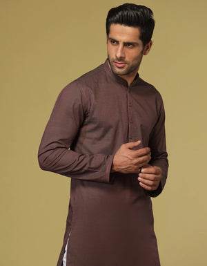 J. Mens Brown Cotton Casual Plain 2-Piece Kurta + Trouser