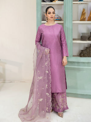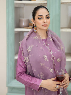 Embody elegance with our 3-piece Lilac katan silk ensemble, showcasing a shirt with intricate sequence boti work and a border-embroidered flapper shirt, complemented by an organza embroidered dupatta. This soft, pastel hue exudes sophistication and poise, ideal for formal events and weddings.