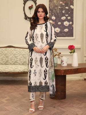 Off-White & Black Digital Print Lawn-Cotton 3-Piece Suit
