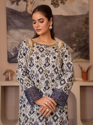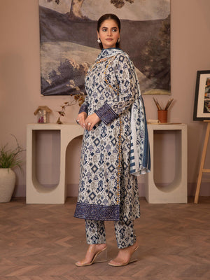 Off-White & Blue Digital Print Lawn-Cotton 3-Piece Suit