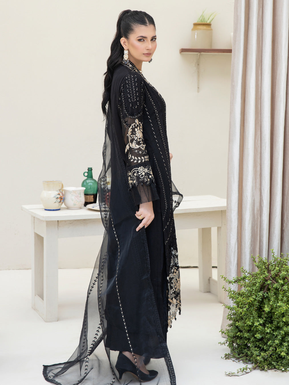 This opulent 3-piece ensemble features a black chiffon shirt, lavishly adorned with intricate all-over black embroidery, shimmering golden sequins, and a majestic elephant motif, exuding a luxurious look. Paired with an organza dupatta featuring delicate embroidery and a ban-style embroidered neck.