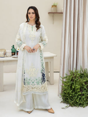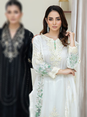 This stunning white dress features off-white embroidery and a matching dupatta with a hint of light green, creating a delicate and enchanting ensemble perfect for any occasion.