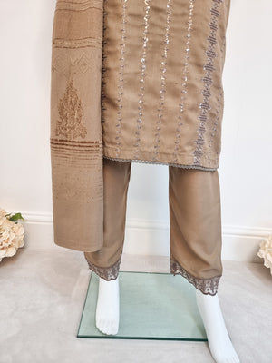 Brown Schiffli Dhanak 3-Piece Suit with Shawl