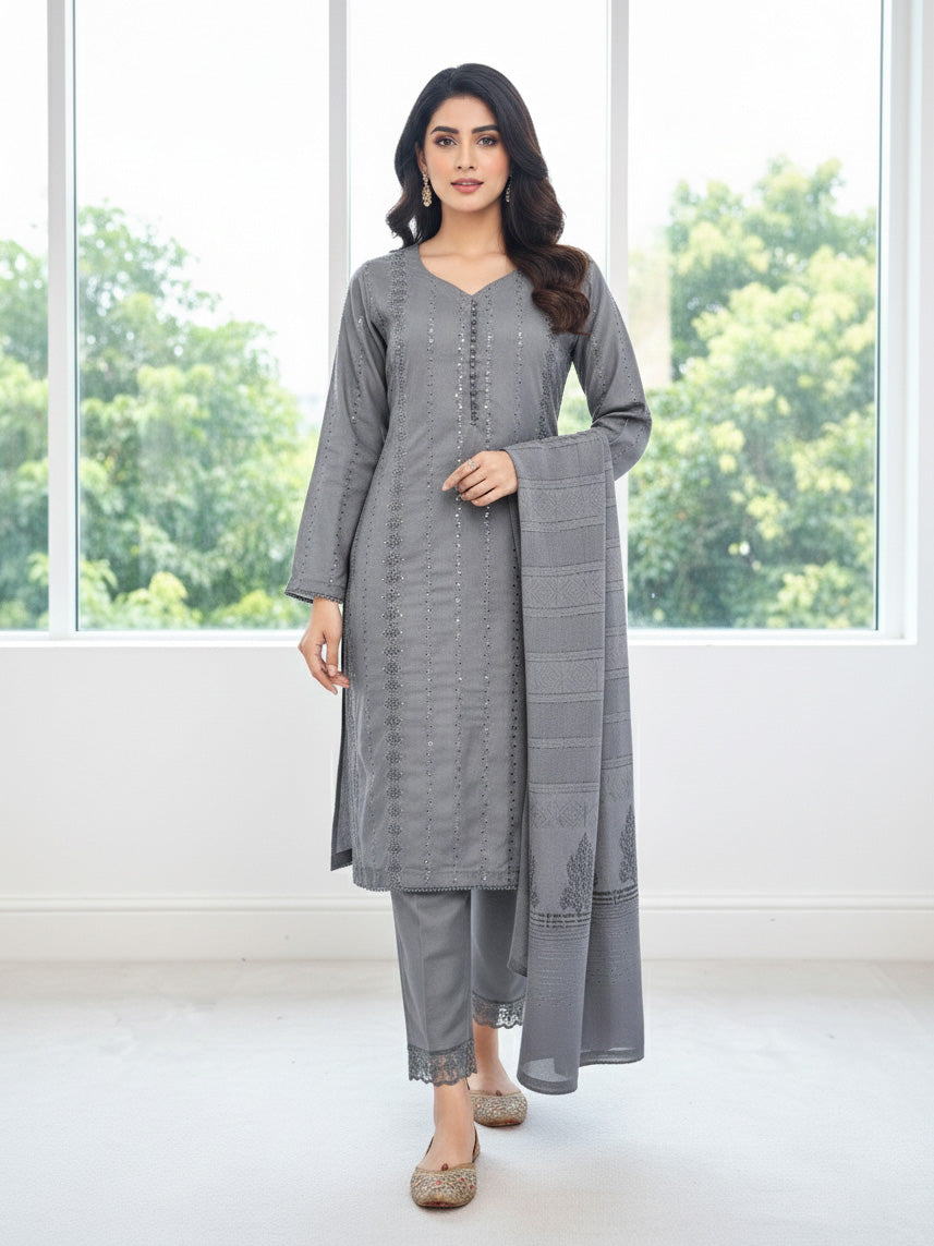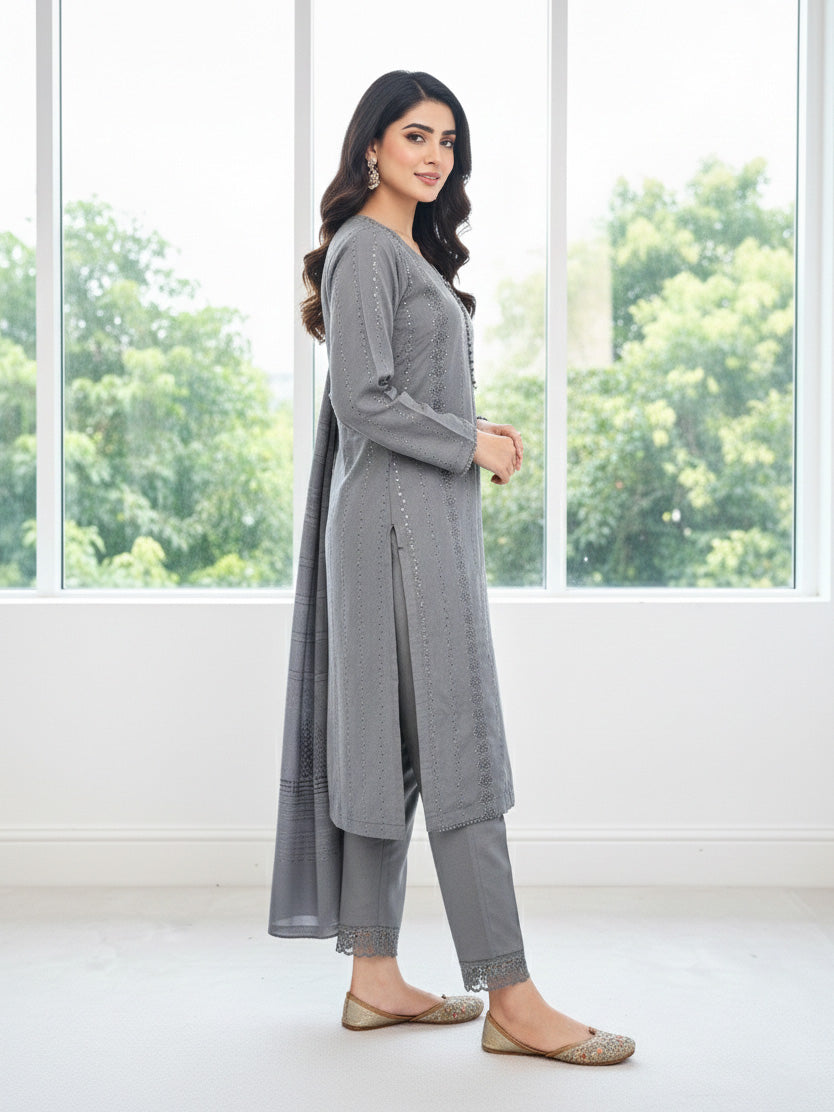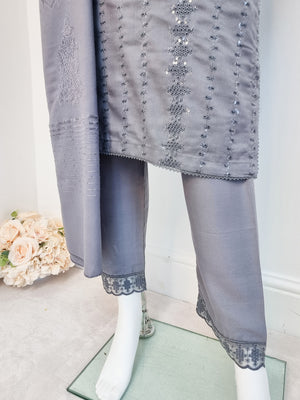 Grey Schiffli Dhanak 3-Piece Suit with Shawl
