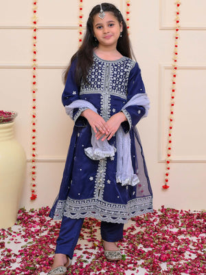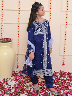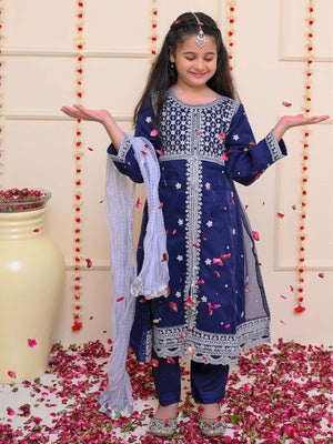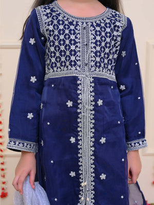 Kids Blue Embroidered Organza Frock 3-Piece Suit