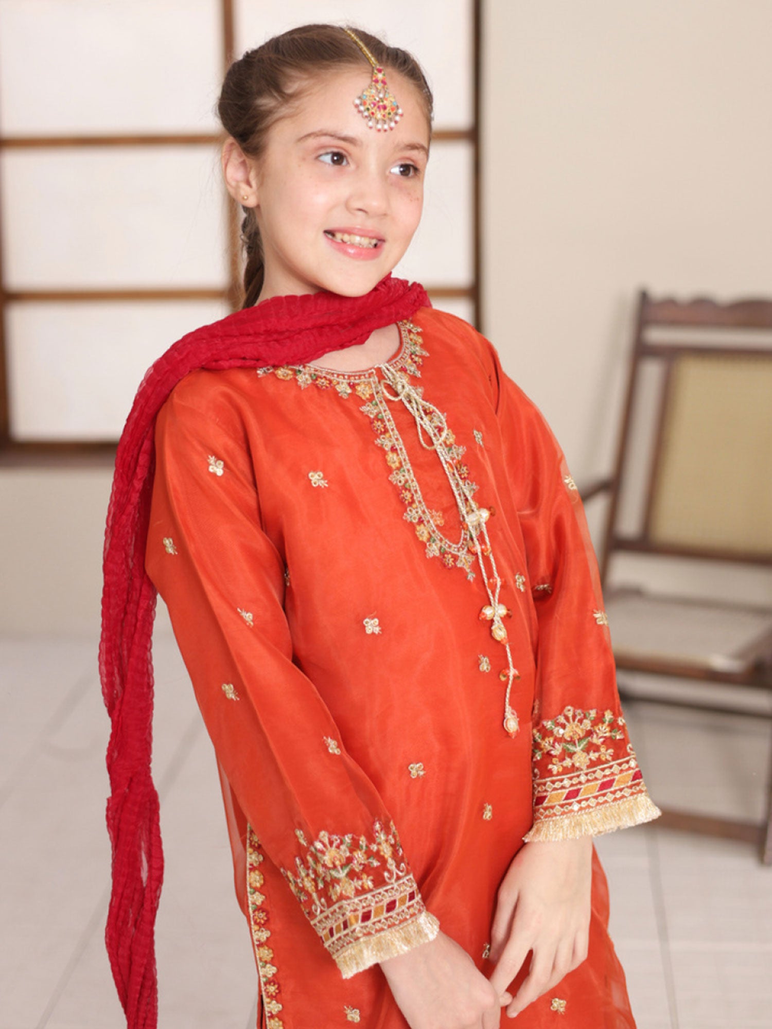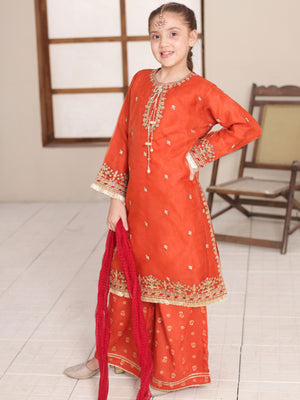 Kids Embroidered Lux Organza Suit - Rust