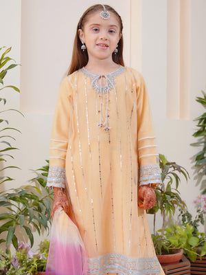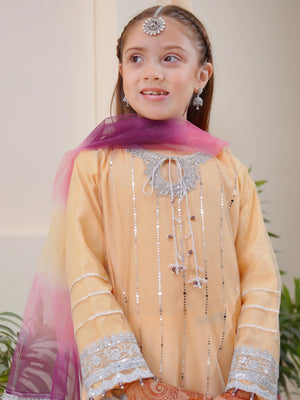 Kids Embroidered Net 3-Piece Suit with Silk Gharara - Golden