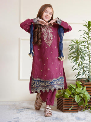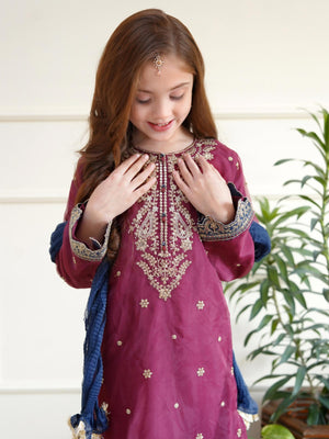 Kids Embroidered Organza 3-Piece Suit - Magenta