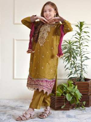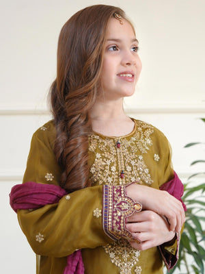 Kids Embroidered Organza 3-Piece Suit - Olive