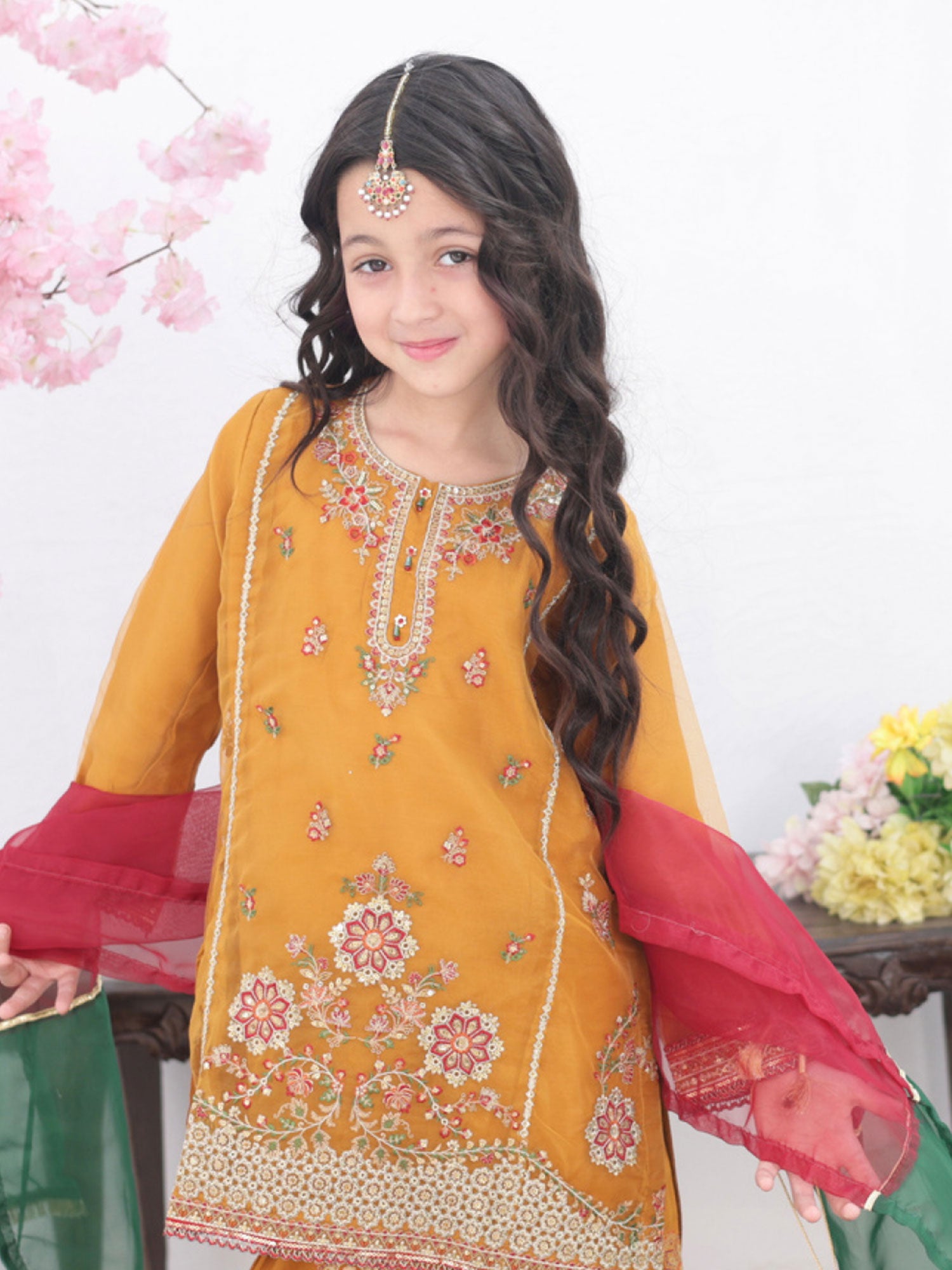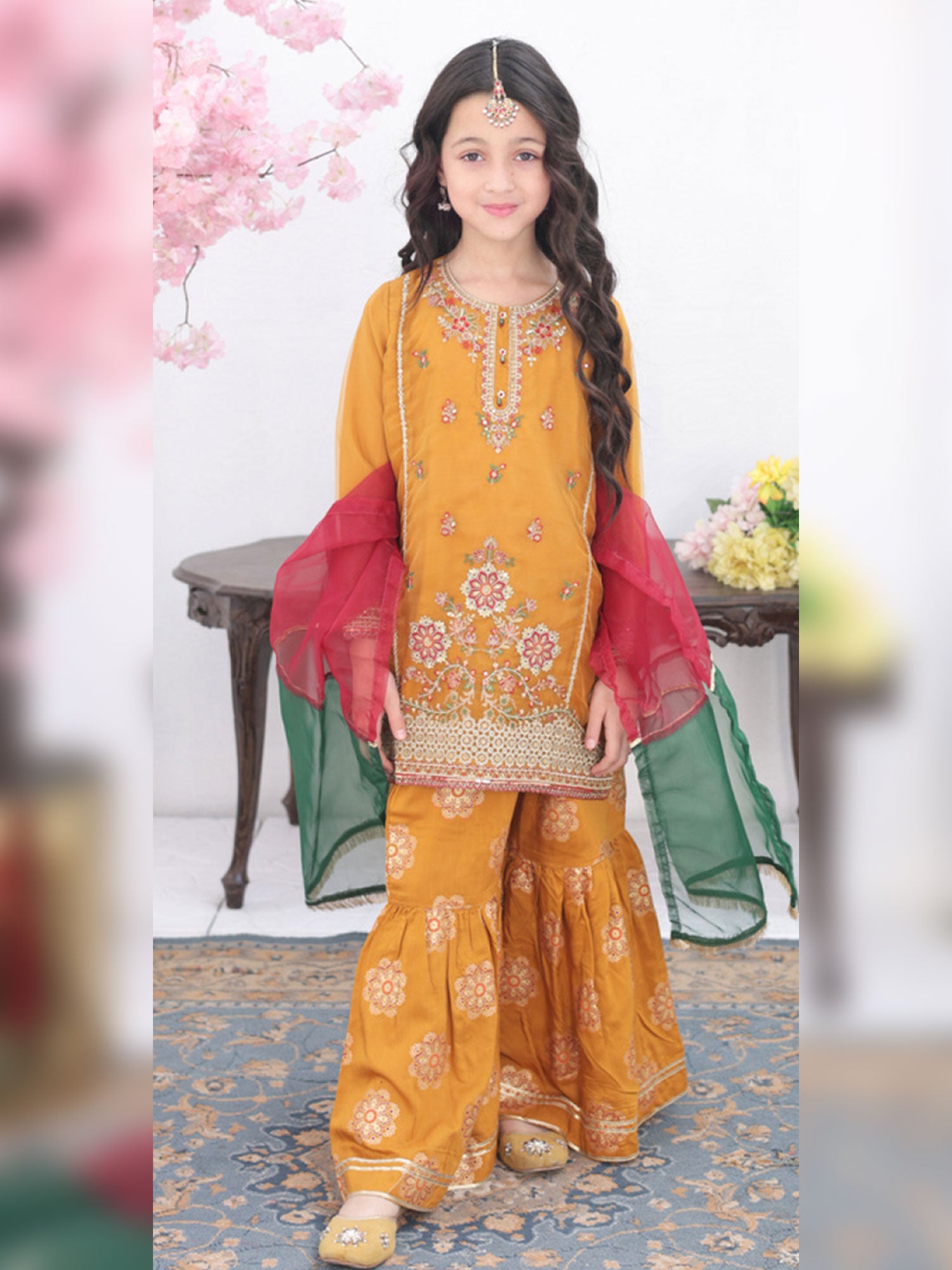 Kids Embroidered Organza Suit with Gharara - Mustard