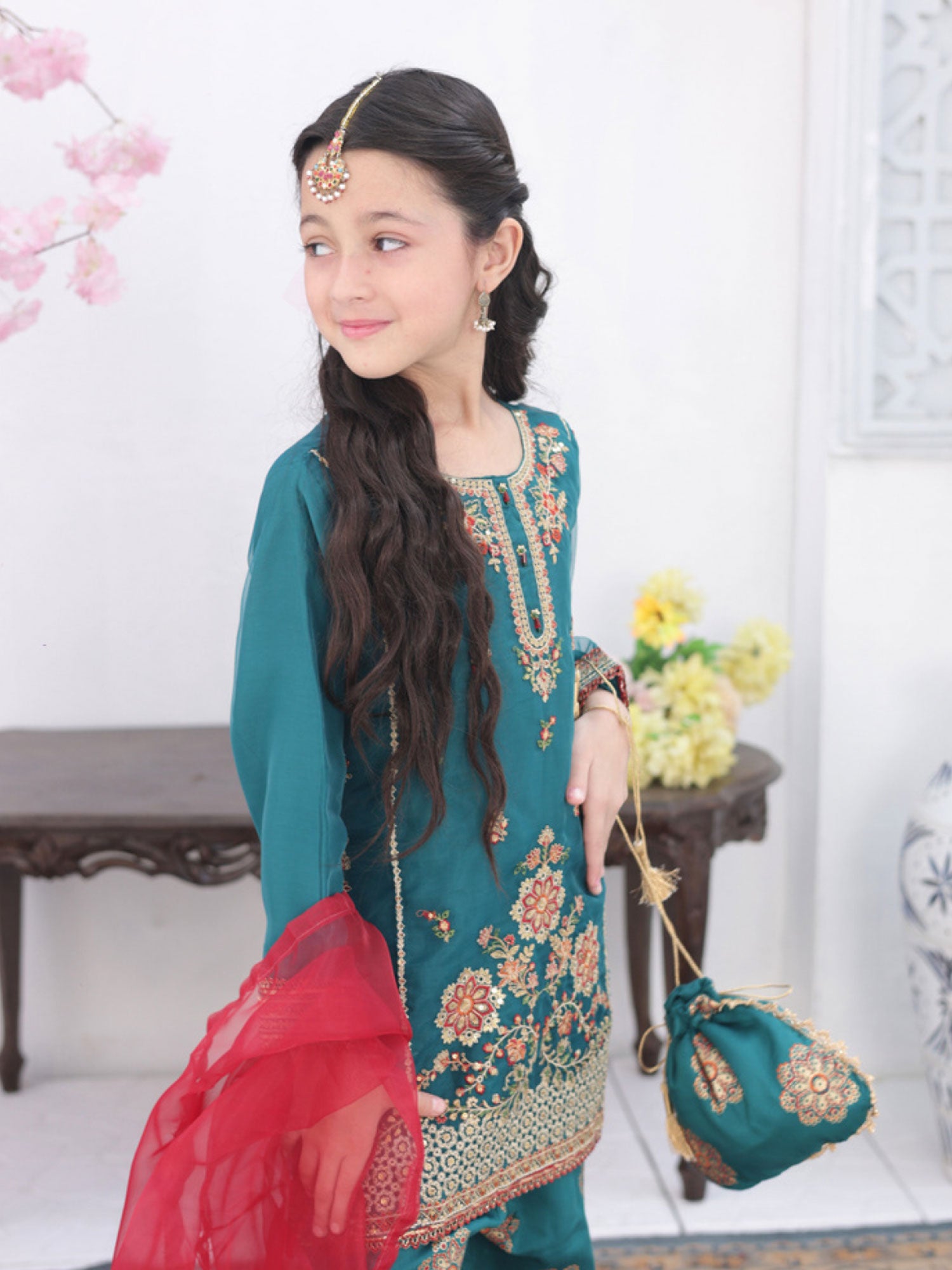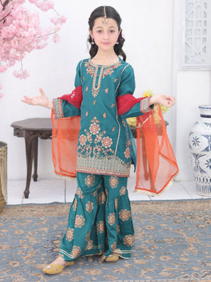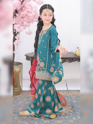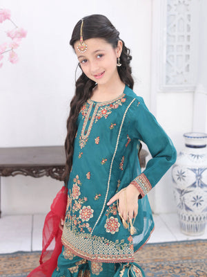 Kids Embroidered Organza Suit with Gharara - Teal