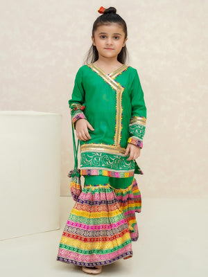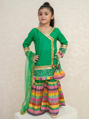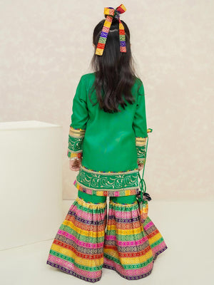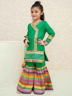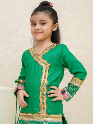 Kids Green Rawsilk Angrakha Suit with Jamawar Gharara