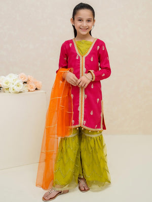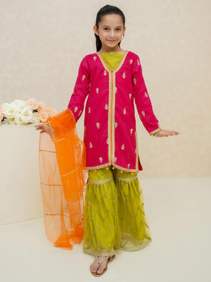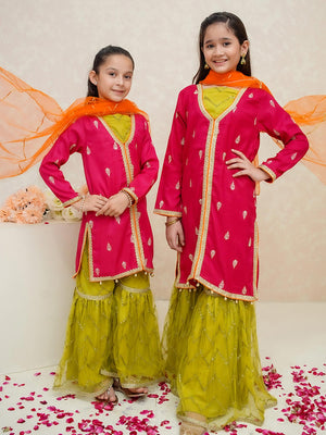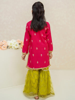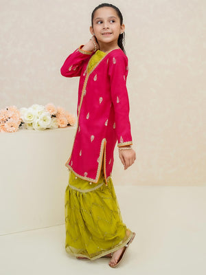 Kids Hot Pink Rawsilk Suit with Lime Green Gharara
