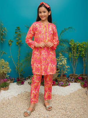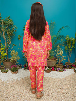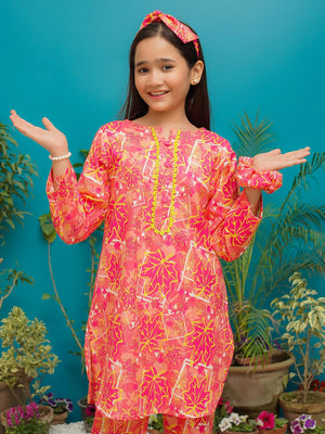 A burst of colors for a lively, fun-filled day! This striking pink outfit features a bold leaf print with delicate front detailing, adding charm to every twirl. Made from breathable lawn fabric, it's perfect for comfort and style.