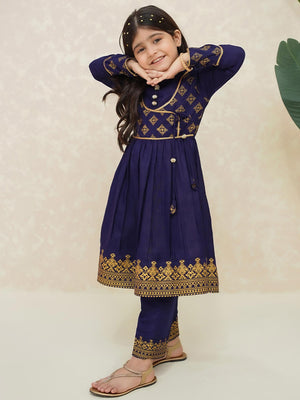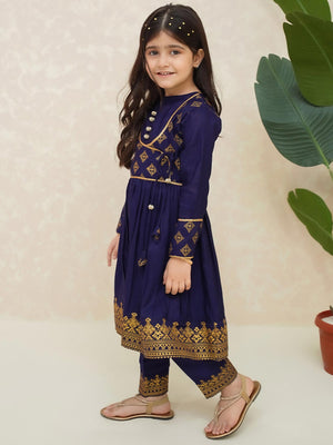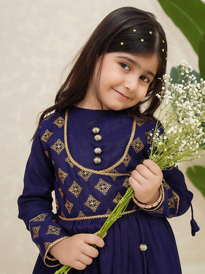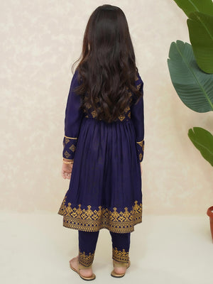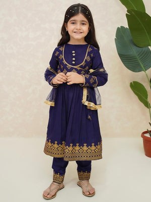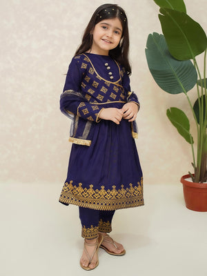 Kids Navy Rawsilk Long Frock 3-Piece Suit
