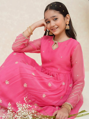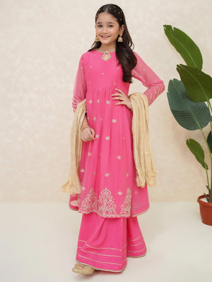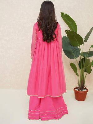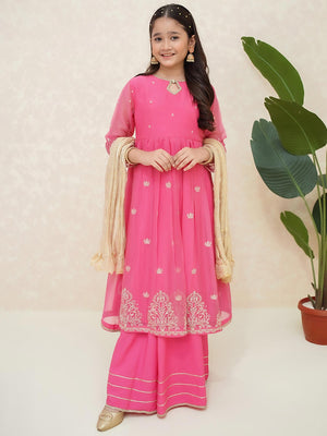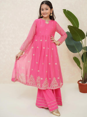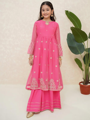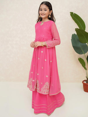 Kids Pink Embroidered Chiffon Suit with Palazzo