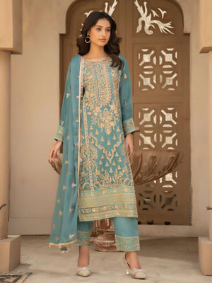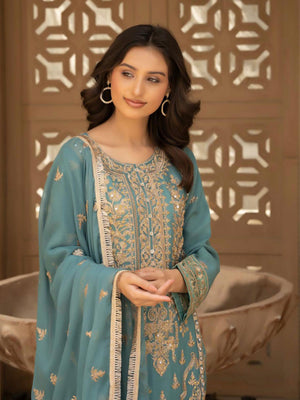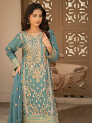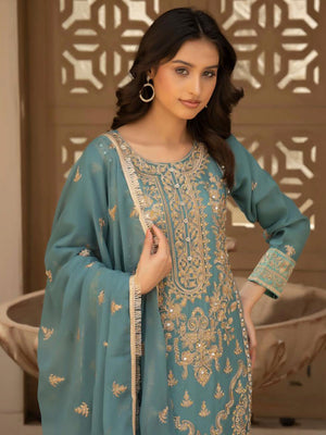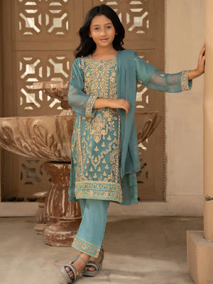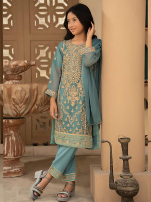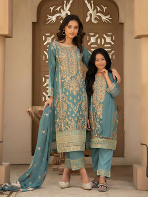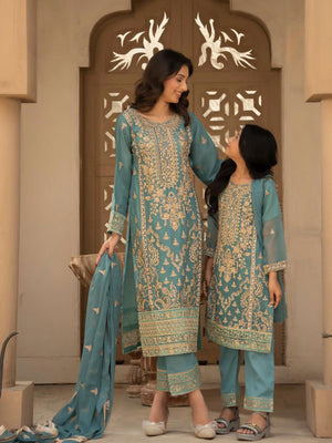 Rangz Chiffon Mother-Daughter Embroidered 3-Piece Suit - Sea Green