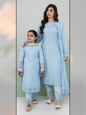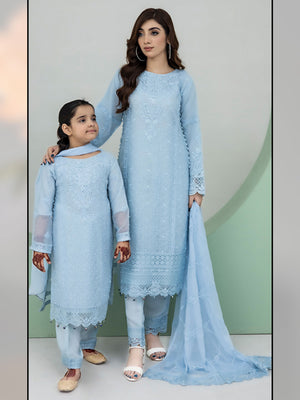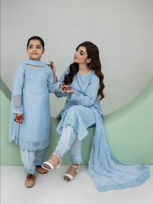 Rangz Chiffon Mother-Daughter Embroidered 3-Piece Suit - Sky Blue