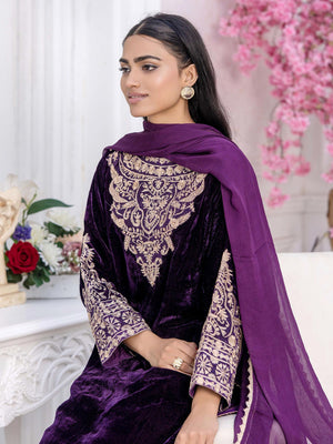 Rangz "Filhaal" Velvet Embroidered 3-Piece Suit - Purple