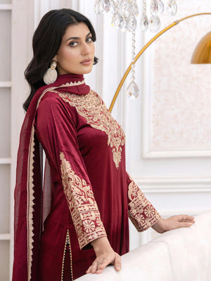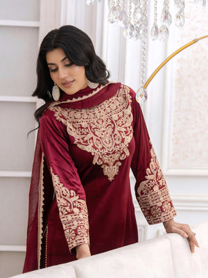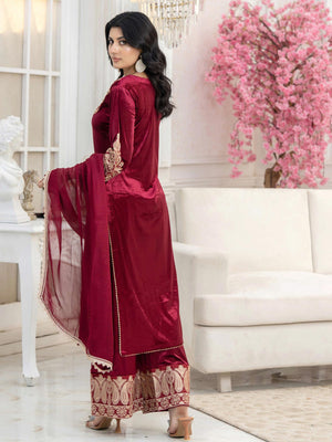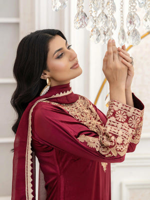 Rangz "Filhaal" Velvet Embroidered 3-Piece Suit - Red
