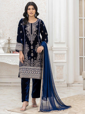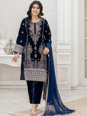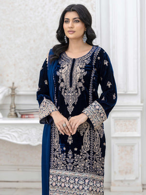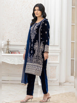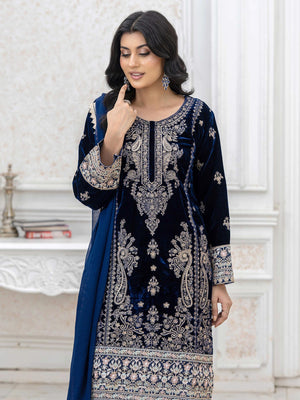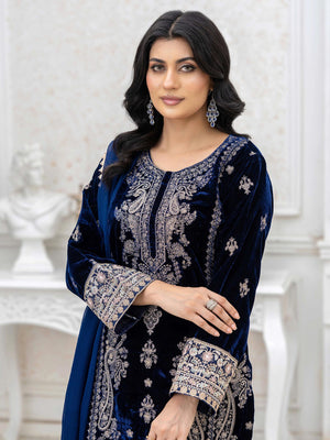 Rangz Lux Velvet Embroidered 3-Piece Suit - Blue