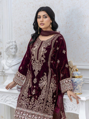Rangz Lux Velvet Embroidered 3-Piece Suit - Maroon