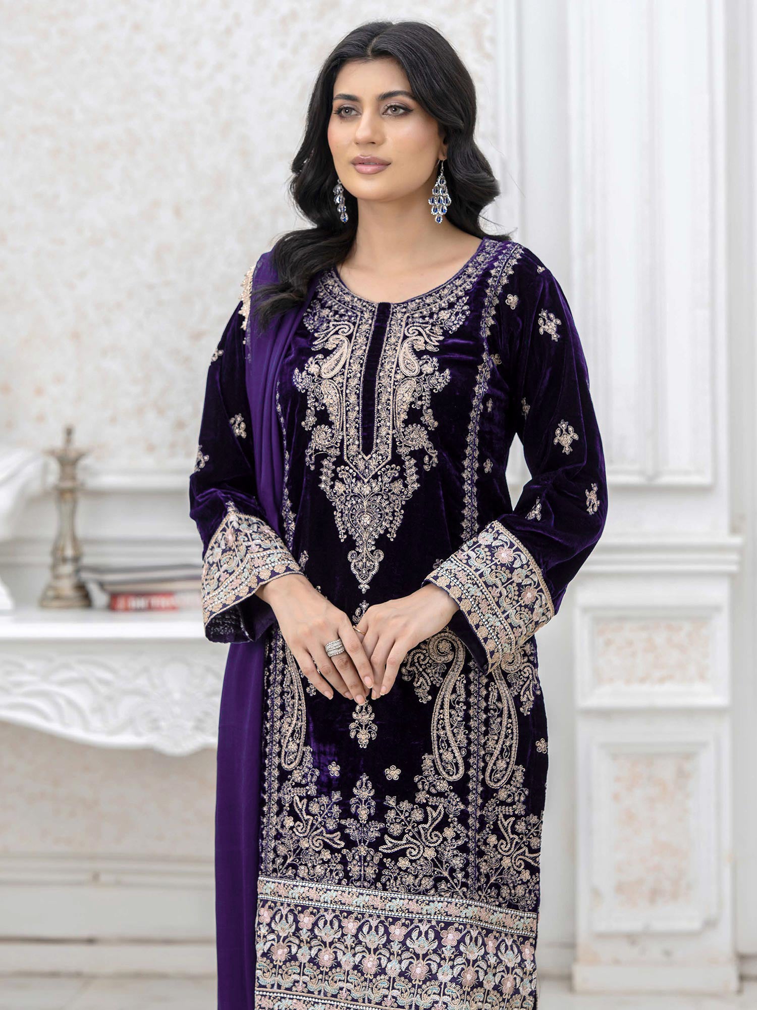 Rangz Lux Velvet Embroidered 3-Piece Suit - Purple
