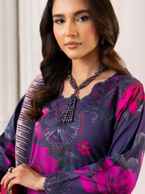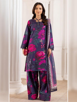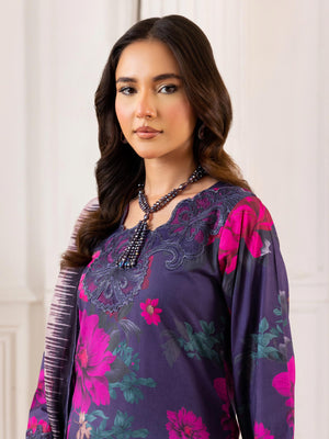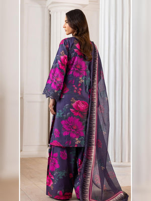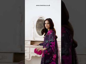 • A rich deep purple lawn outfit adorned with bold magenta floral prints and soft green foliage, creating a striking contrast.