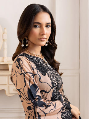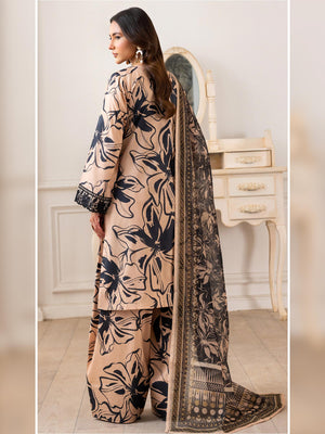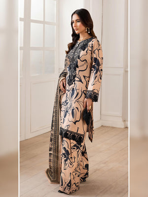 - Crafted on a soft peach lawn base adorned with bold black botanical prints.