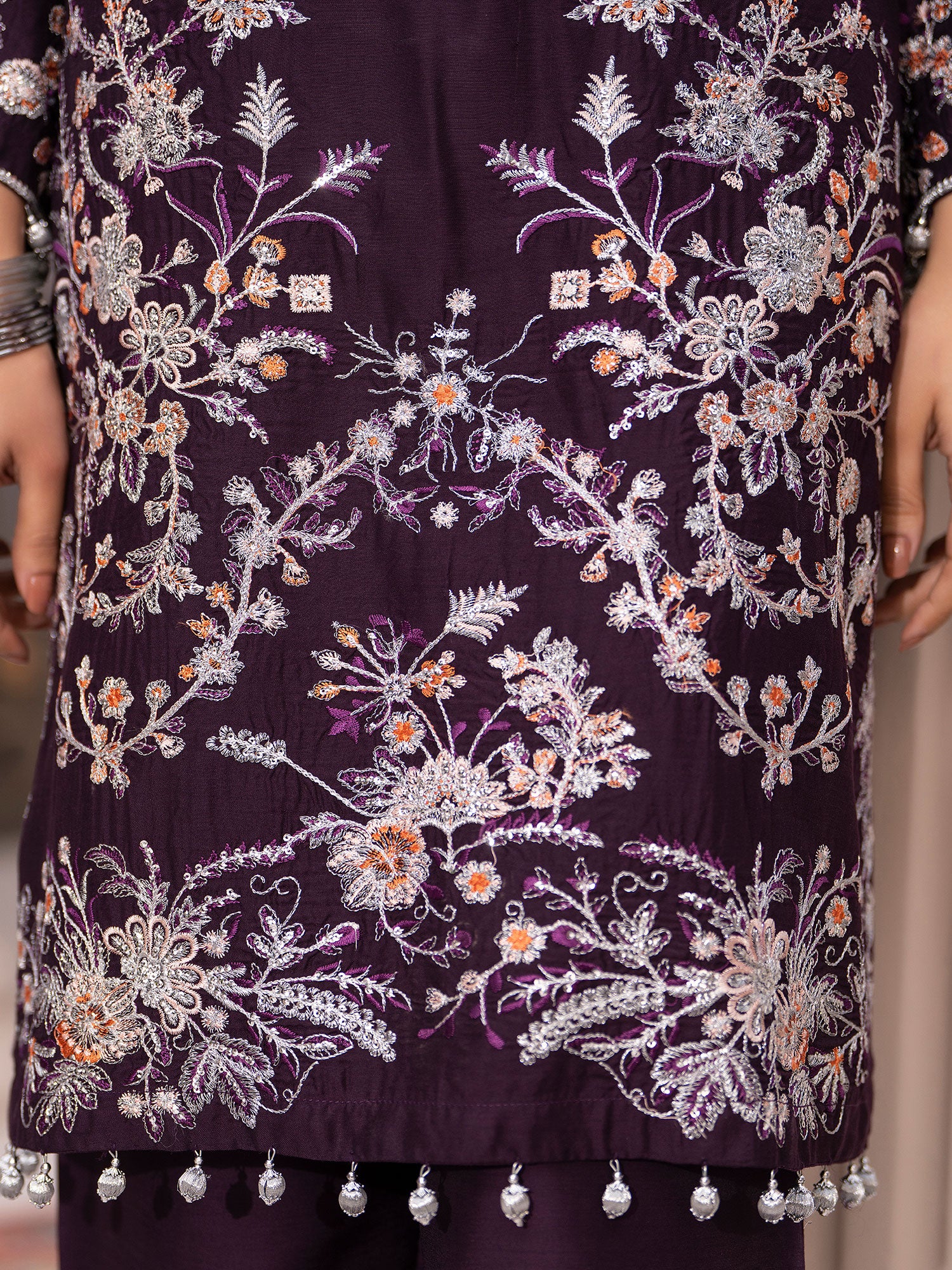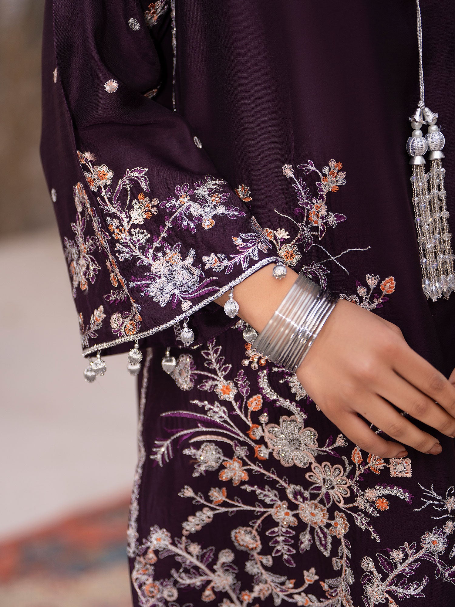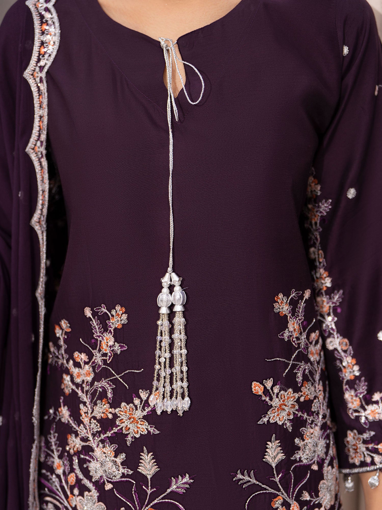 - Shirt (Kameez): A straight-cut shirt featuring a round neckline. Silver and peach threadwork, sequins, silver bead tassels (latkan).