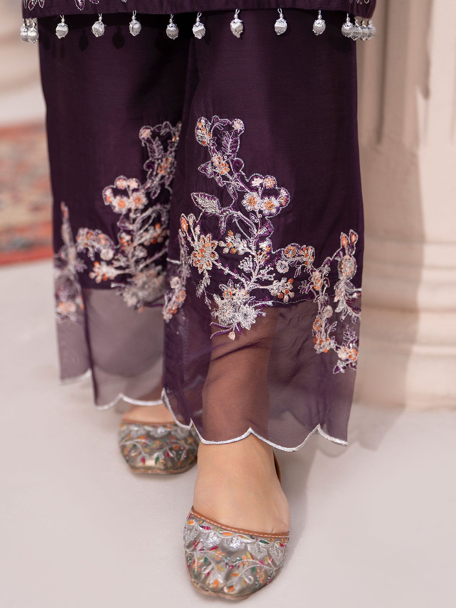 - Trousers: Matching wide-leg trousers with embroidery and organza patchwork.