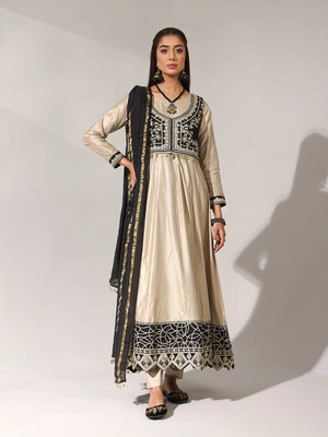 Emanate ultimate grace in this beautifully unique three piece ensemble. The frock style chambray katan shirt is gorgeously worked with a tilla embroidered border and waistcoat. Donned with sequences and tassels, the look comes with a chambray katan trouser and viscose dupatta with gold shade detailing which truly elevates the sophistication of this entire festive fit.