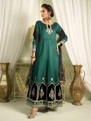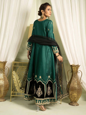 This maxi-style three-piece outfit is a beautiful show of elegance that will have you looking just perfect this season. The maxi-style chambray katan is beautifully worked with tilla embroidery and sequence embellishment with applique border. Paired with a chambray katan trouser and an accent-coloured gorgeous net dupatta, this look is breath-taking at the least.