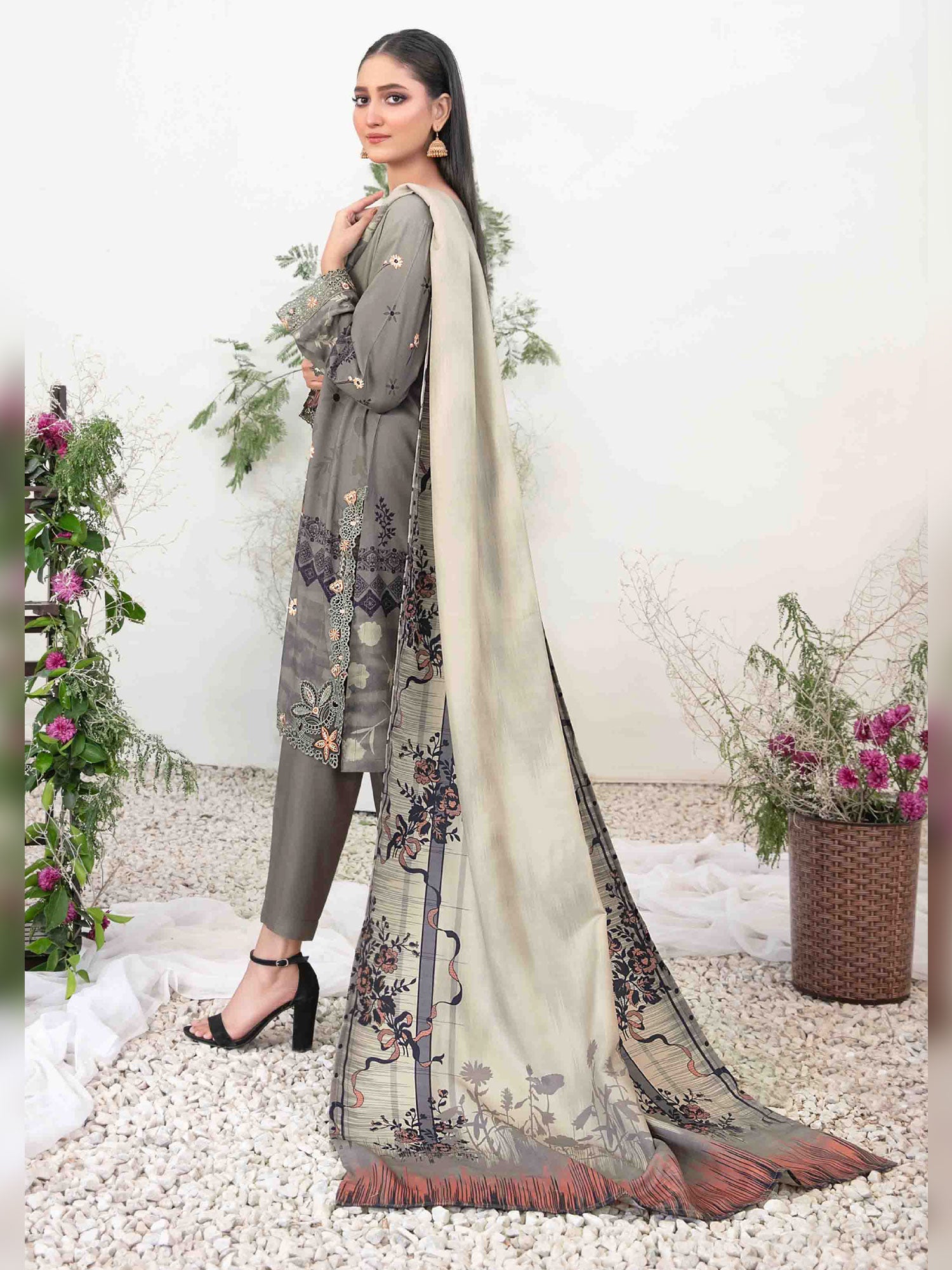 Tawakkal "Suhaila" Embroidered Staple Linen Suit (D3702) - Olive-Grey