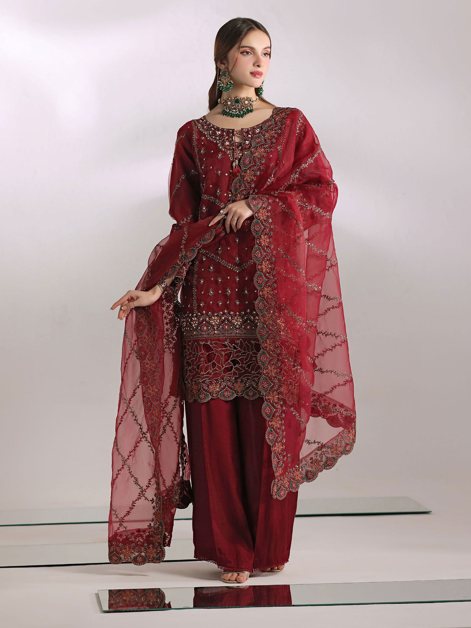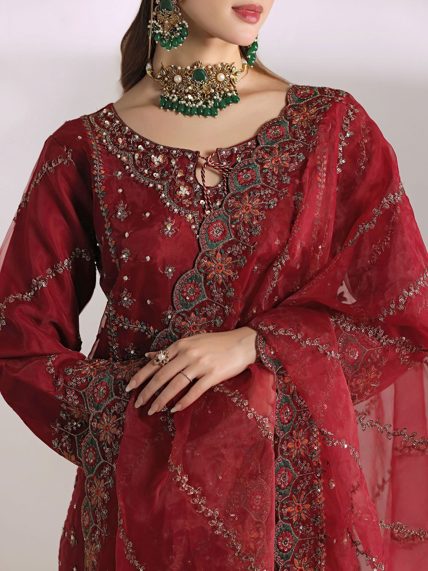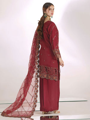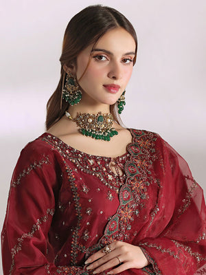 Saffron Flame is a bold celebration of regal elegance, rendered in a rich, commanding red that exudes confidence and grandeur. Intricately adorned with refined embroidery and delicate embellishments, this ensemble reflects masterful craftsmanship and timeless artistry. The beautifully detailed neckline, ornate borders, and sheer embroidered dupatta create a striking silhouette that balances drama with sophistication. Designed for festive occasions and statement moments, Crimson Royale embodies power, poise, and enduring luxury in every thread.