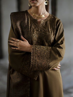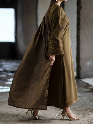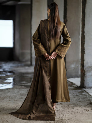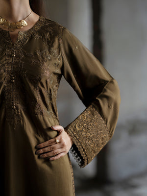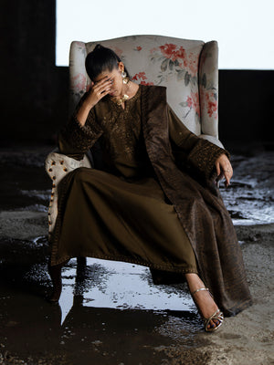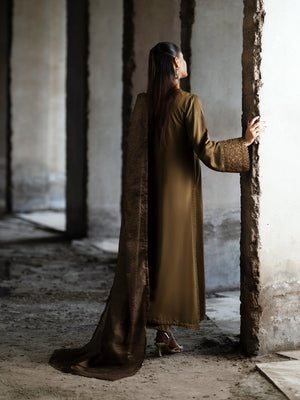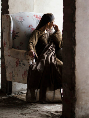 This ensemble features a silk-viscose suit paired with a matching dupatta, enhancing the design’s depth and elegance. The smooth fabric drapes effortlessly, creating a flowy silhouette with a touch of refined sophistication. Perfect for both day functions and evening gatherings, it’s a versatile outfit that embodies grace and style, making it an ideal choice where understated luxury is key.