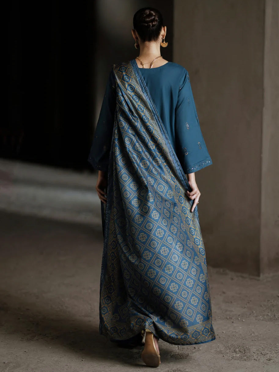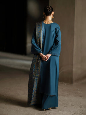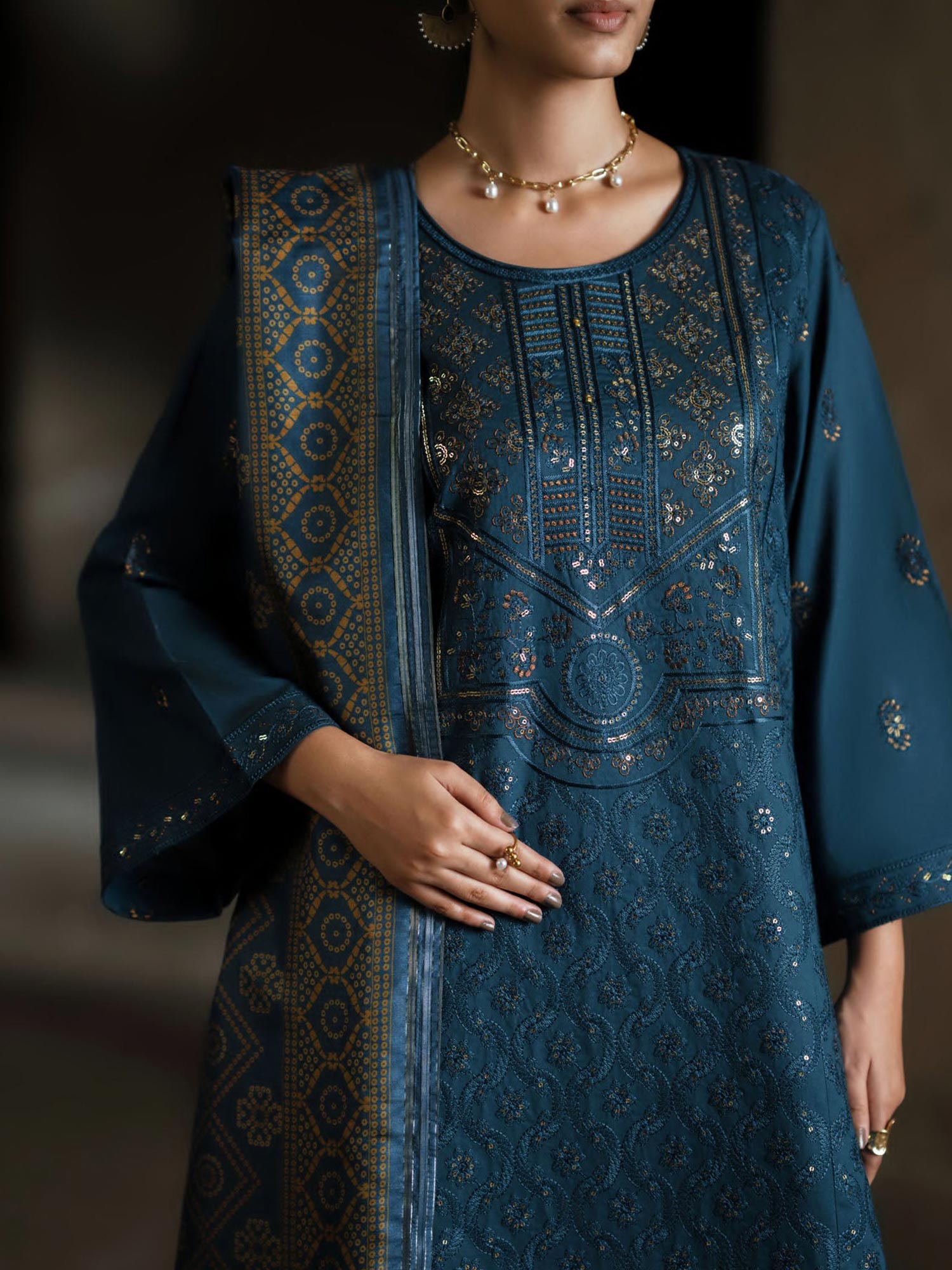 This outfit is a deep teal silk-viscose ensemble, enriched with geometric embroidery and delicate mirror accents across the bodice. The design blends modern flair with traditional elegance, making it a standout choice for festive gatherings and formal evenings. Its graceful drape and refined detailing ensure both comfort and sophistication.